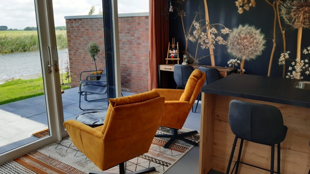 Een prachtige accommodatie met uitzicht over landerijen en aan de rivier de Boarn.
